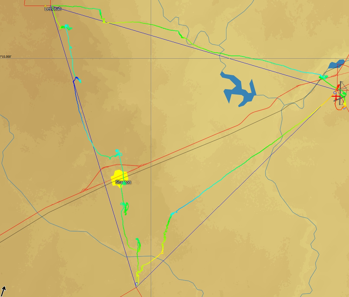 The next challenge immediately presented itself on both sides of the course line. Rain was falling just right of the course line but heavy rain and lightning ahead to the far left was the real challenge since it blocked the final leg back to the airport. Some pilots decided it was unsafe and landed, some charged ahead and flew close to (or through) the storm, and others, like me, slowed up and waited to see if the storm would continue to grow or rain itself out. I sat in extremely weak climbs for almost 45 minutes before I was convinced the storm was dissipating and I could safely move on. I lost many points but I was comfortable with my decision to slow up.